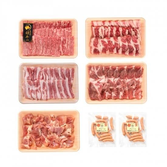 内容量:あがの姫牛カルビ焼肉用(新潟県産)400g、牛バラ焼肉用(US産)400g、三元豚バラ焼肉用(メキシコ産)400g、三元豚肩ロース焼肉用(メキシコ産)400g、鶏モモ焼肉用(BL産)400g、あらびきソーセージ(山長ハム)190g×2袋、
