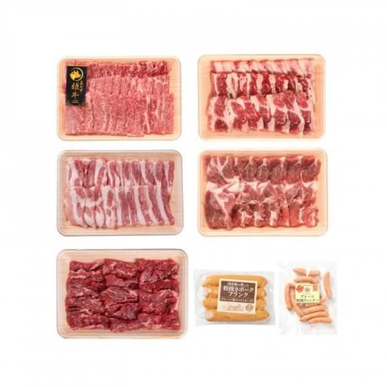 内容量:あがの姫牛カルビ焼肉用(新潟県産)400g、牛バラ焼肉用(US産)400g、三元豚バラ焼肉用(メキシコ産)400g、三元豚肩ロース焼肉用(メキシコ産)400g、牛カイノミ焼肉用(豪州産)400g、粗挽きフランク(山長ハム)240g、あらびきソーセージ(山長ハム)190g