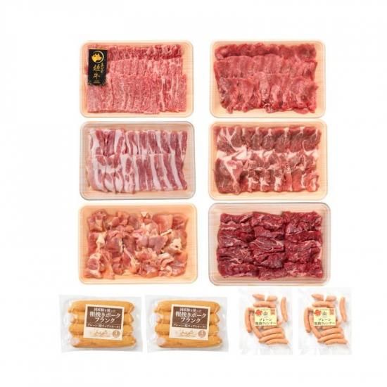内容量:あがの姫牛カルビ焼肉用(新潟県産)400g、牛タン焼肉用(US産)400g、三元豚バラ焼肉用(メキシコ産)400g、三元豚肩ロース焼肉用(メキシコ産)400g、鶏モモ焼肉用(BL産)400g、牛カイノミ焼肉用(豪州産)400g、粗挽きフランク(山長ハム)240g×2P、あらびきソーセージ(山長ハム)190g×2P